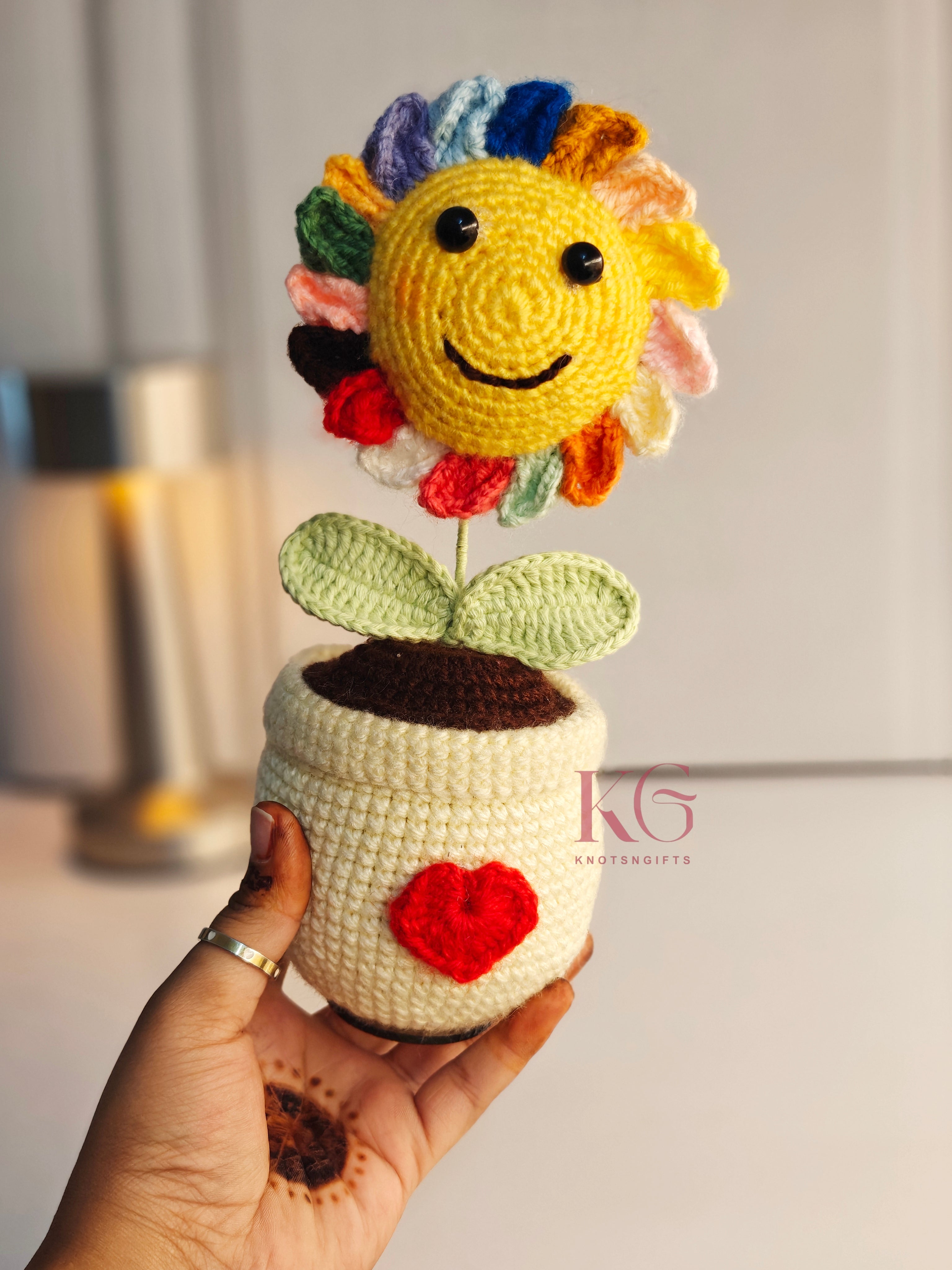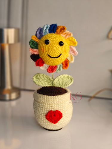 Includes crochet pot with multicolour crochet flower and signature smiley detailing with leaves in pot