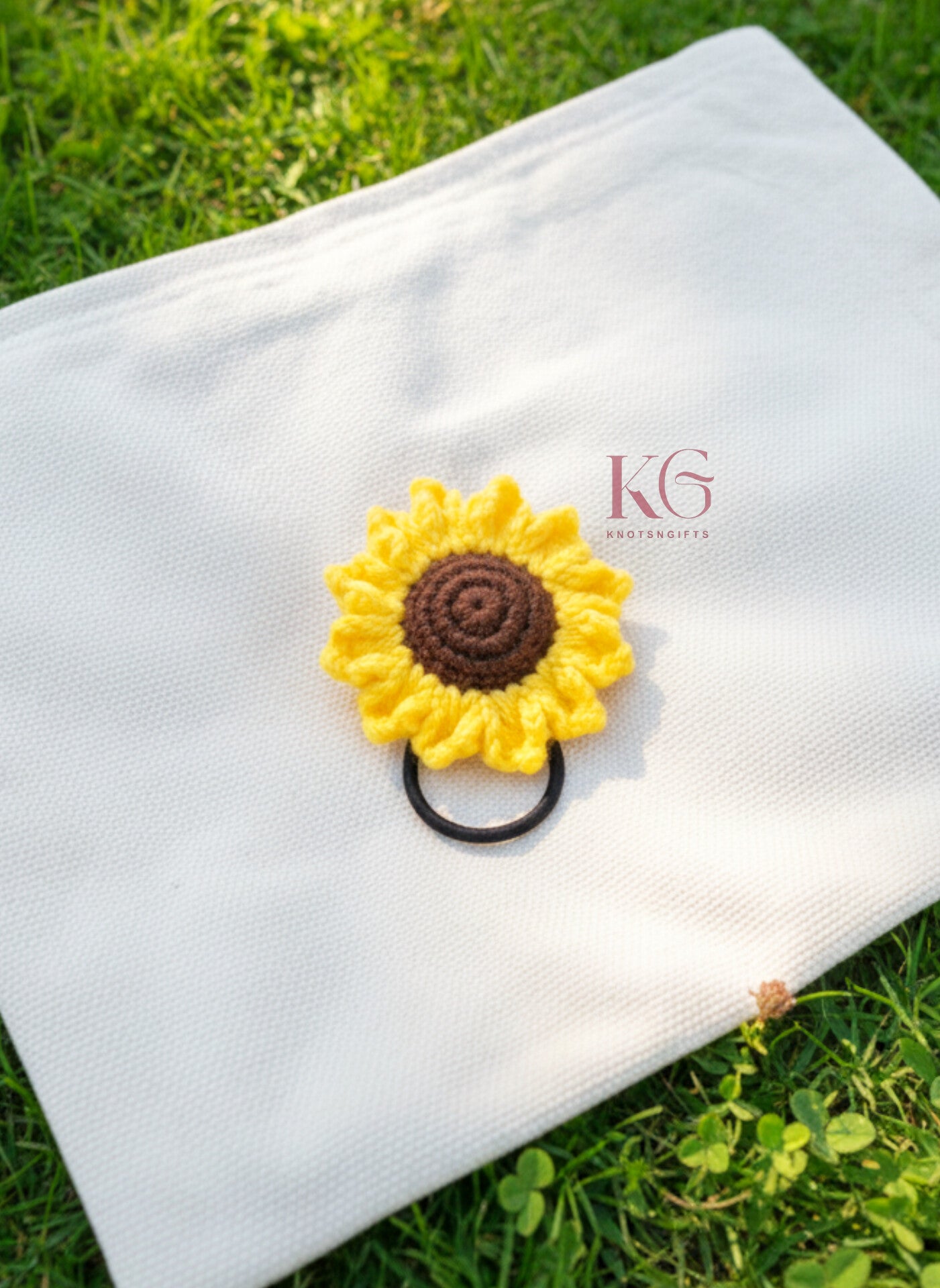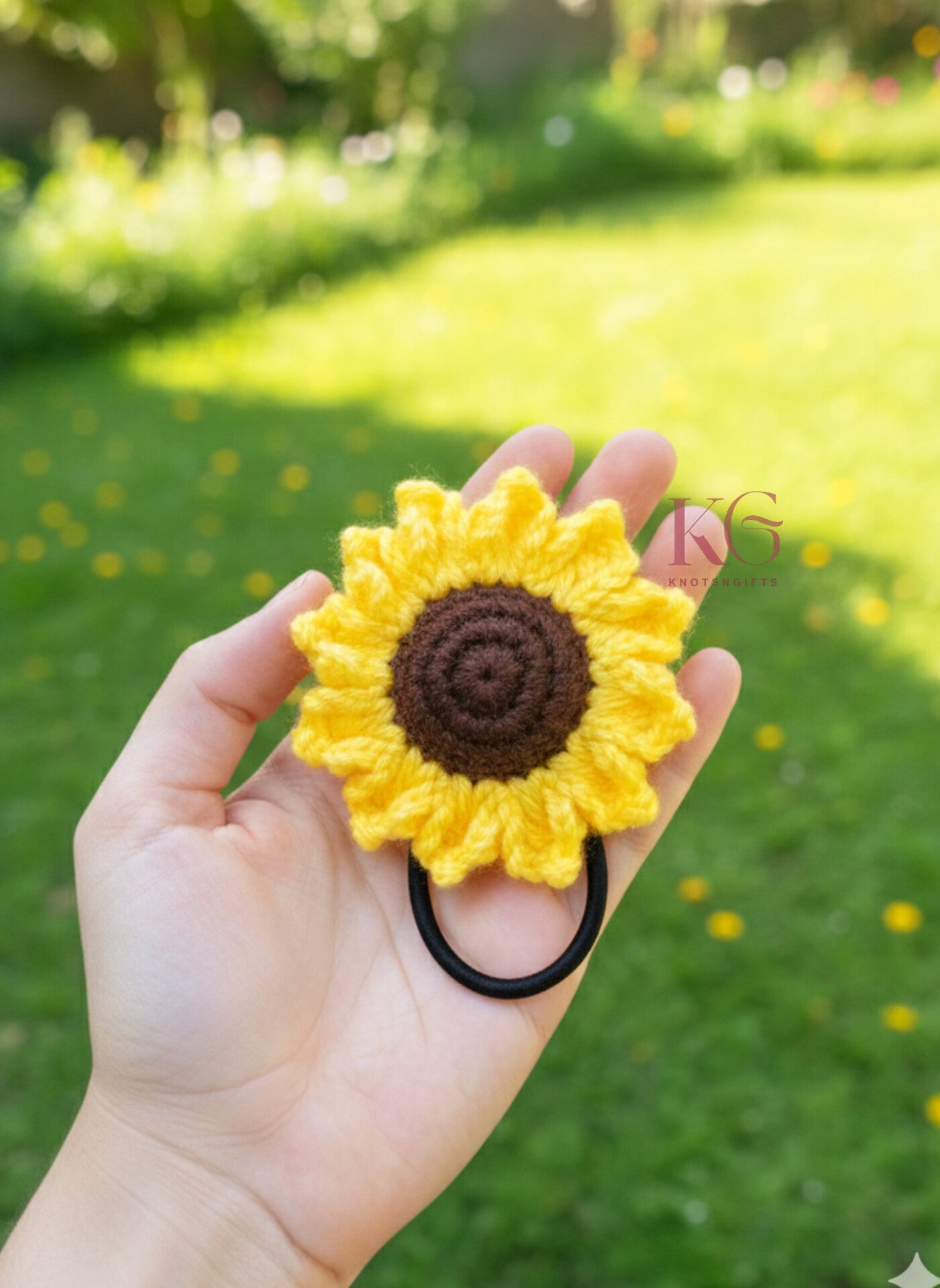 Add a cheerful floral touch to your hairstyle with our handcrafted Sunflower Hair Tie. Beautifully crocheted with bright yellow petals and a detailed brown center, this crochet hair tie brings a pop of sunshine to any look. Perfect for casual wear, festive occasions, or as a cute everyday accessory, this handmade sunflower scrunchie combines charm, comfort, and durability in one beautiful piece.